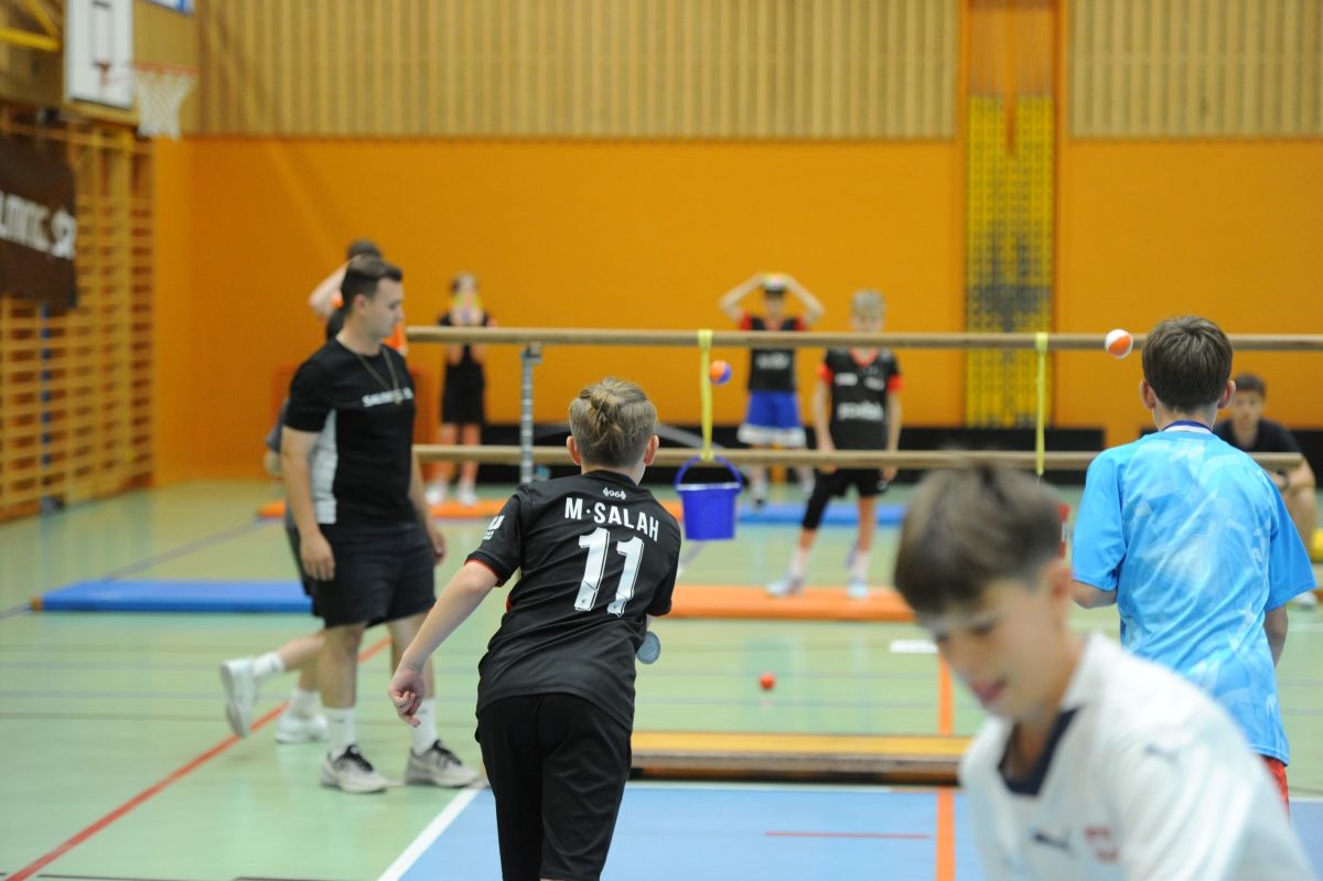 Am Morgen gab es feinen Zmorgen mit Brot, Butter, Konfi und Müesli. Danach trainierten wir in der Halle. Wir übten Passen, Schiessen und Zusammenspielen.